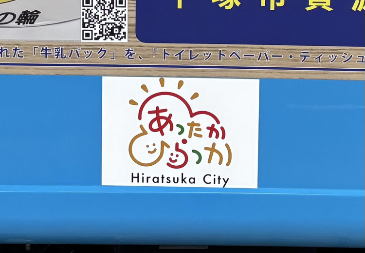 青くてピカピカなボディに貼られた、「あったかひらつか」ステッカーが目印です!